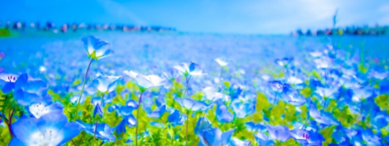 春は真っ青で小さな花をつけるネモフィラが見晴らしの丘を埋め尽くし、空の青とのコラボレーションを楽しむことができます。