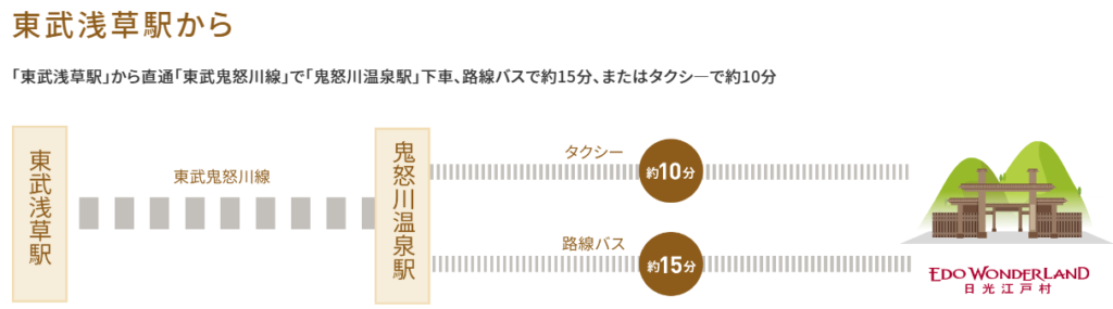 東武浅草駅から直通「東部鬼怒川線」で江戸ワンダーランドの最寄り駅まで向かうことができます。